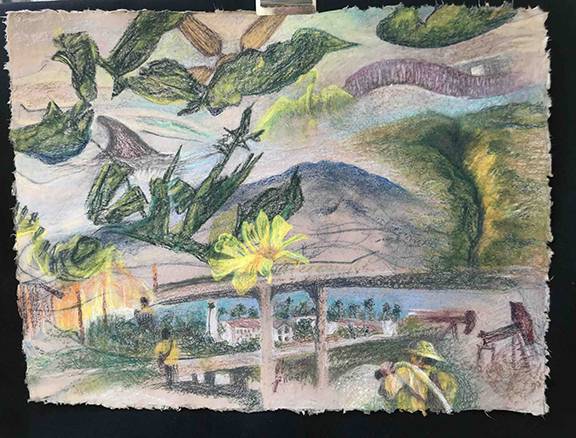 The rolling hills and mountains of Southern California, the biosphere, the range of climates from desert to snow covered peaks roamed by mountain goats in one cable car ride the soaring mountains over the sea, the vertigo of a place prone to earthquakes, fire, floods, mudslides, a virtual sim city in real time, life on a movie set in a movie setting. That which inspired David Hockney, the golden sunshine, the movement of topographical features like hyper-suggestive outlines in a Howard Hodgkin painting, this is where the East Village painter and experimental filmmaker Lili White found herself witness to the landscape and its human encroachments upon violently transforming during the wildfires of 2025.