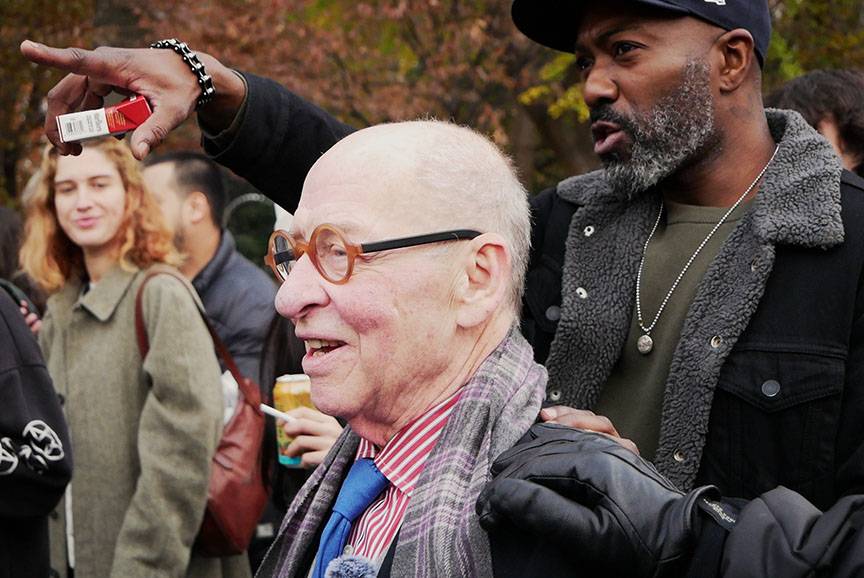 The attention of the crowd—which the New York Post estimated at over 1,500—was fixated on the center. Bob was there somewhere, but I couldn’t see him. Nearly everyone had their arm outstretched to capture Bob on camera, catch one of the cigarettes and custom lighters he was tossing out, or hold their lit cigarette in solidarity. Others had mounted trees, light posts, or their friends’ shoulders to see Bob for themselves.