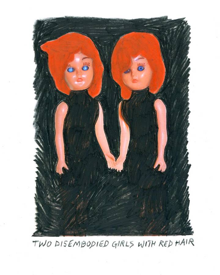 The dolls represent a transitional space, between youth and age, between the imaginative and the actual. Marcia’s art makes a space between states — that is her statement. She opened a new way of expressing the void we all carry. She created a twin/ alter ego to keep herself company. In “TWO DISEMBODIED GIRLS WITH RED HAIR,” the black dresses lose their edges and merge with the background, much as Marcia merged herself with the scene.